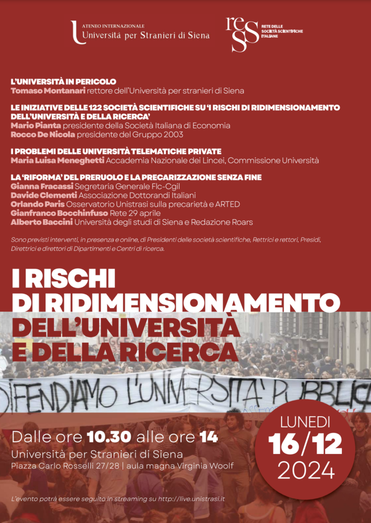 Il 16 dicembre, dalle ore 10.30-14.00, si terrà all’Università per Stranieri di Siena (aula Virginia Woolf) l’incontro “I rischi di ridimensionamento dell’Università e della ricerca”, organizzato in collaborazione con la Rete delle società scientifiche italiane.